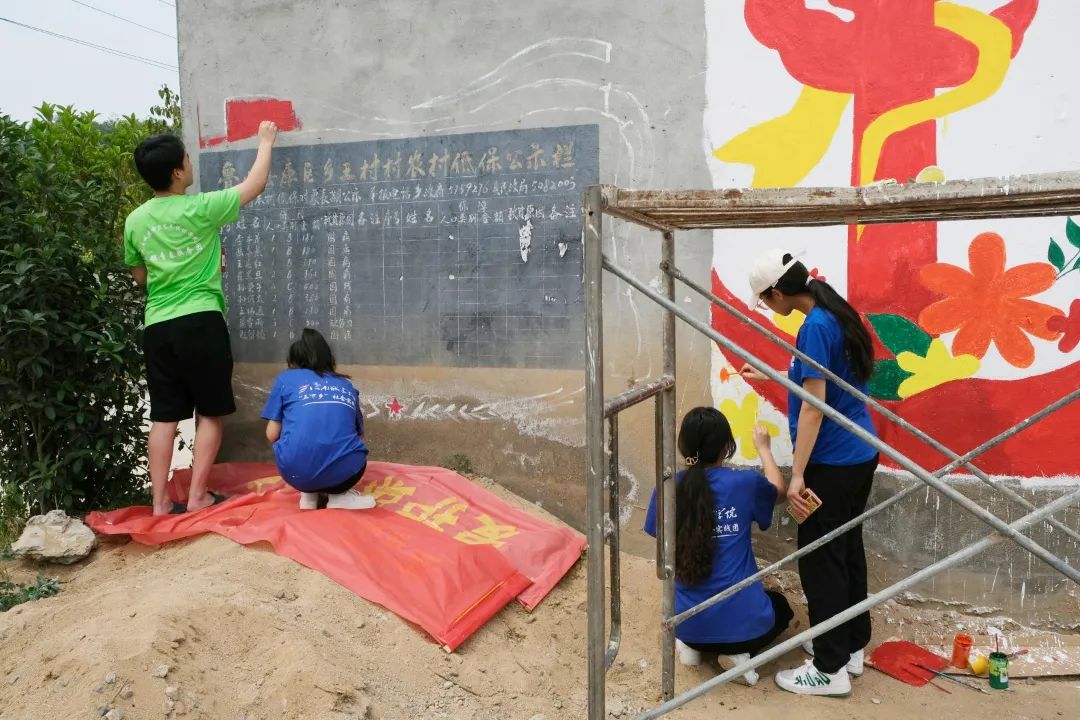 在鲁山县库区乡王村的几天时间里,“三下乡”成员们每天早起晚归,在烈日炎炎下,在深夜渐凉里,员工志愿者不言劳累,精心设计,潜心创作,以丙烯和画笔为绘画材料,并融入红色文化和国风元素,充分展现出习近平新时代中国特色社会主义思想和祖国上下五千年以来的传统文化,助力新农村建设。在辅导员郭梦垚的带领和指导下,员工志愿者们根据当地情况,结合美术专业知识,制定了独具特色的绘制方案,员工志愿者经过仔细地挑选和考虑后,确定了绘画墙面,进行粉刷绘画,大家战高温、斗酷暑,克服了种种困难,最终绘出了完美的墙绘。
