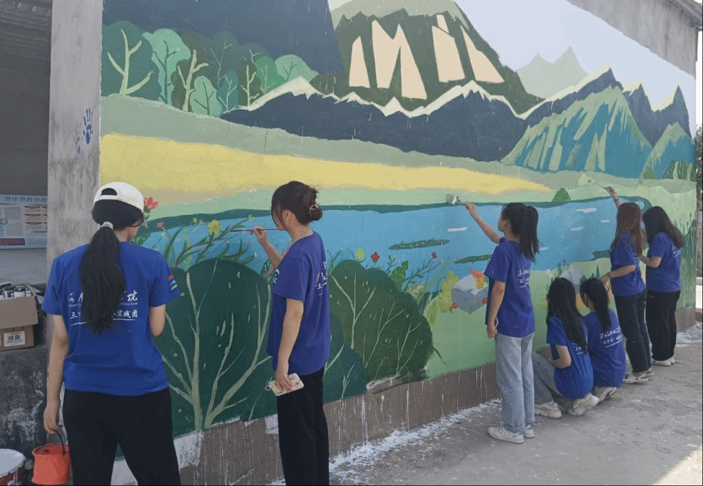 在当地村干部和村民的积极配合下,实践团成员们充分挖掘当地优秀传统文化,深入了解当地村民的需求,紧密结合所学专业知识,发挥专业技能,坚持理论联系实际,学以致用,设计了“绿水青山就是金山银山”的墙绘主题,用饱满的热情,认真勾勒线条,填涂色彩,让国家政策深入人心,村容风貌焕然一新。
