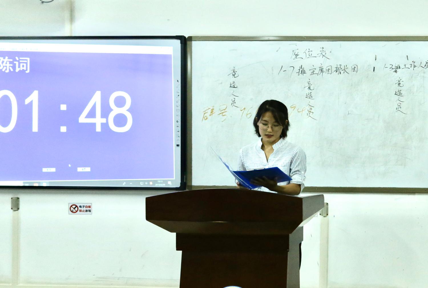 面试开始,参加面试的每位同学都自信地走上讲台,分别就各自的基本情况、对工作岗位的认识、竞选原因及工作设想进行了简短而精彩的演讲。他们语言流畅,仪态端庄大方,有的诙谐幽默,给人印象深刻;有的言语犀利,让人肃然起敬。慷慨激昂的演讲,将此次面试推向高潮。各位主席团成员和部长团成员也对各位同学的面试做了详细的记录。最后,员工会主席向阳阳对员工会今后的工作提出了要求和建议,对这次选举大会做出总结。