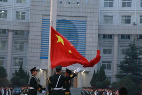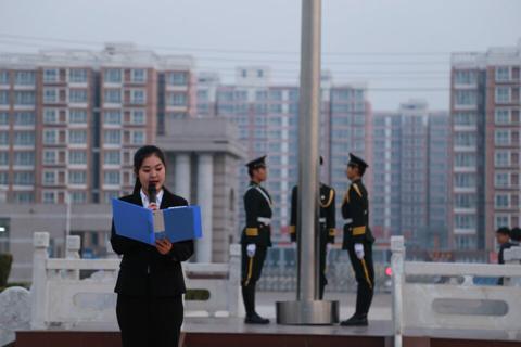 主持人宋婷婷宣布升旗仪式正式开始,在全体师生的注目礼下,英姿飒爽的国旗护卫队队员们迈着庄严而整齐的步伐护送鲜艳的五星红旗进场。行礼完毕,伴随着庄严的《中华人民共和国国歌》,五星红旗冉冉升起,迎风飘扬。在场的每一个人向国旗行注目礼,深怀对祖国无限的热爱和崇高的敬意。