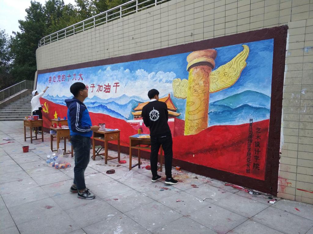 活动前几天,beat365中文官网的同学们积极参与手绘墙初稿的设计,又在课余时间加紧了练习,力争把最美的画面留在墙上,进一步吸引并影响其他同学,感受到十九大的欢乐氛围。设计稿主题鲜明,富有创意,整洁美观。10月16日,活动准时开始,同学们分组合作,分别来到几面需要绘制的墙面开始作画。他们分工明确:有的负责构图,在墙体上勾勒出清晰的轮廓;有的负责调色,红的黄的白的黑的颜料在灵巧的双手间生成七彩斑斓,符合画面的颜色;有的负责涂色,拿起各式画笔在墙体上细致涂刷。慢慢地,墙面开始生动、鲜活起来。经过近三天的精雕细琢,需要绘制的墙面基本已经全部完成。同学们有些许疲惫,但看着自己的辛勤成果,都欣慰的笑了,墙绘固然美丽,但同学们的笑容却更加美丽,他们给这个灰蒙蒙的天空增添了不少灿烂。绘制完成的涂鸦墙也生动活泼、图文并茂,寓教于乐,富有时代感、艺术性和浓厚的党的气息,不仅很好的宣传了十九大的到来,更美化了校园环境。