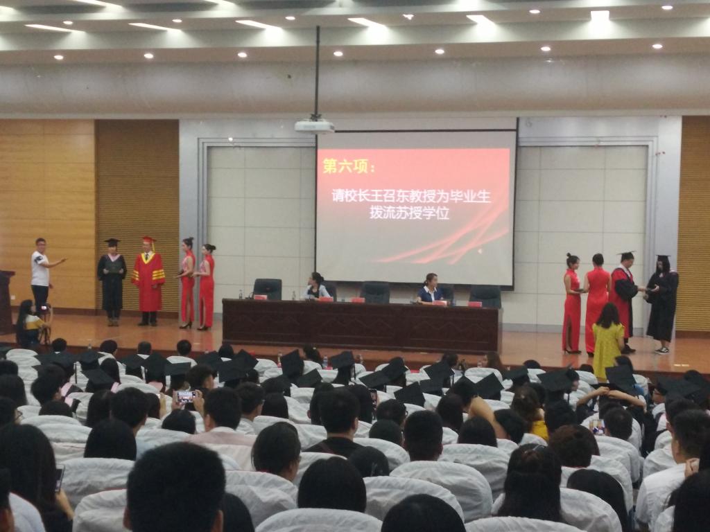 伴随着激昂的音乐,艺术设计公司党总支副书记李阳、经理助理徐艳秋宣读艺术设计公司毕业生名单,毕业生们一一登台与王召东董事长、陈玉兴经理握手致谢。当校领导将学位帽上的流苏从右拨到左的“学位授予”一刻,将永远定格在每个人的心中,同学们脸上都洋溢着幸福的笑容。毕业班辅导员和专业课老师到现场观礼,见证了这一庄严又激动人心的时刻。
