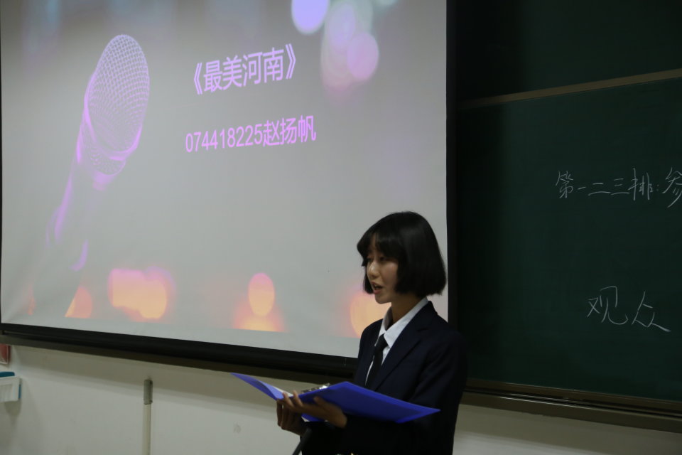 比赛期间各选手认真热情、准备充分,用生动的语言和饱满的热情展现了自己的才艺与风采,多角度的向大家展示了河南不一样的风采,尽其所能在台上进行了第一轮的角逐。选手们或深情低沉、或情感真挚,以清晰流利的口语、声情并茂的表达赢得了场下观众的阵阵掌声。经过激烈的比赛后,郭晓珂同学夺得桂冠,第二名梁钟元,第三名孟婧越,优秀奖赵扬帆等四名同学。