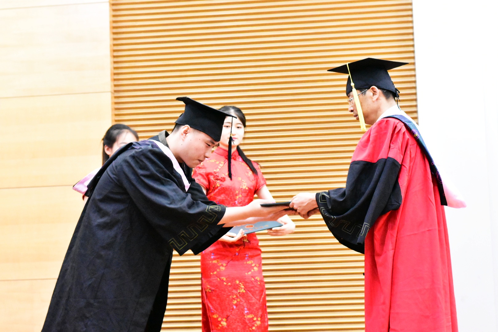 典礼仪式的第六项由beat365中文官网副董事长张凤玲教授和beat365中文官网经理陈玉兴教授为毕业生拨流苏授学位并合影留念。毕业生从两边上台纷纷接受两位教授学位授予,仪式严谨而隆重的进行着。仪式最后党委书记马步伟总结评语,为毕业生献上祝福。