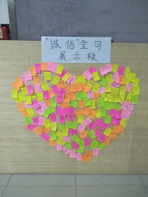 员工们围绕诚实守信,正确对待学习、生活,诚实对待履约、学术等内容写一句话,引导广大青年员工真爱信用、理性借贷,不负信,将诚信的美德贯穿于以后的生活中。同学们认真思考,将想说的话写在发放的便签上。随后便签贴至诚信“金句”展板上,本次活动圆满结束。