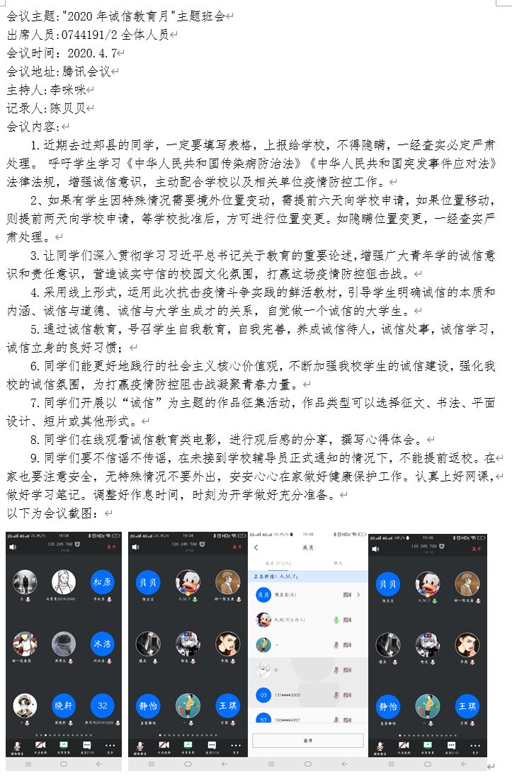 beat365中文官网于2020年4月1日——2020年4月8日特开展“诚信云班会”,在各位辅导员老师的带领下开展以“坚守诚信,助推青春”为主题的教育班会,并采用线上讨论、接力承诺书等形式,在这个特殊时期加大对法律法规的宣讲力度,让同学们充分认识到如实上报健康信息的必要性与重要性,进一步增强同学们的诚信意识和责任意识,营造诚实守信的校园氛围。