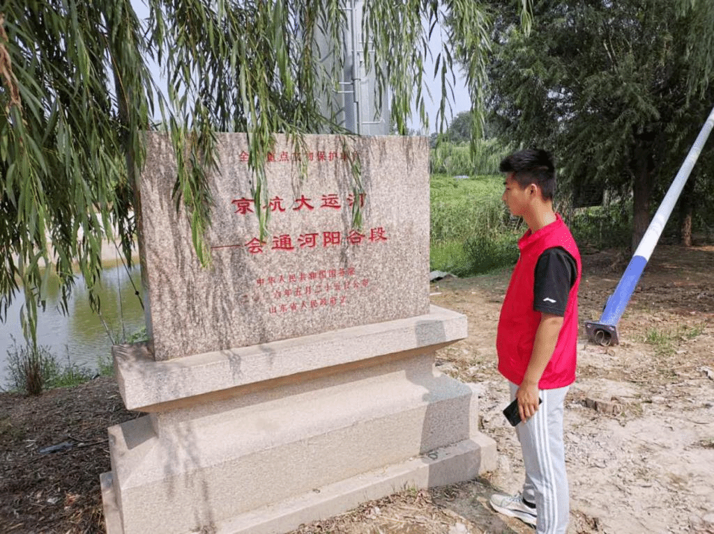 实践队员在对京杭大运河会通河阳谷段进行调查,对河流历史文化的演变以及对河流水质状况进行了解。