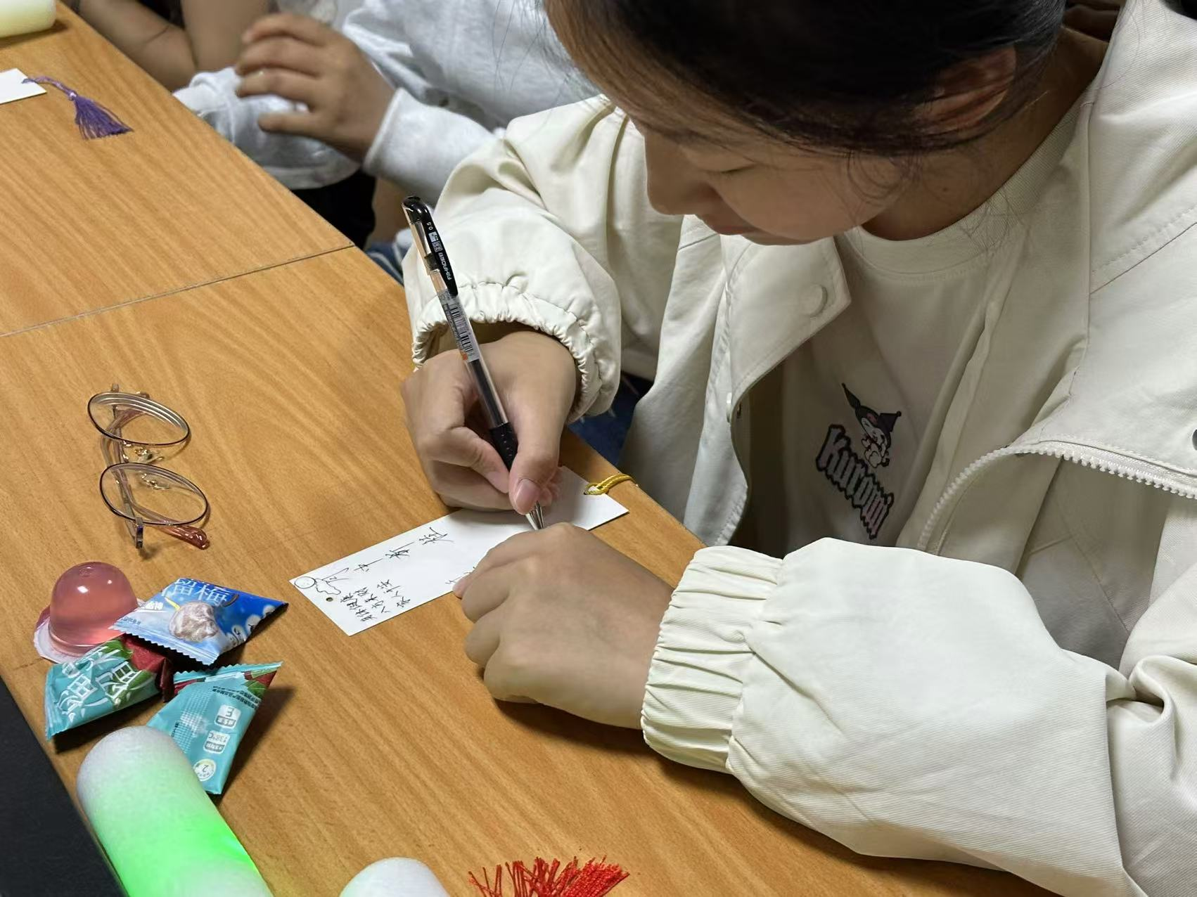 活动伊始,同学们在签到墙处签名,并领取荧光棒,随后积极踊跃地参与到丰富多彩的游园活动之中。在“相思寄鸿雁·书信寄情”环节,同学们精心筹备中秋心愿卡,以最为古朴且富有温度的方式,将内心的心愿以及对亲人、友人、恋人的深切思念之情诉诸笔端。在“玉镜映飞花·诗词竞猜”环节,充满了浓郁的文化韵味,主持人以“花”“好”“月”“圆”为主题的飞花令,吸引每5人上台切磋,参与者需在10秒内迅速应答,充分展现出丰厚的诗词储备,每组的第一名荣获小礼品一份。“品月试酥饴·共品月饼”环节趣味横生,同学们两两搭档,其中一人被戴上眼罩,另一人将手中的月饼喂给对方,并让其猜出月饼的口味,猜对最多的小组获胜。