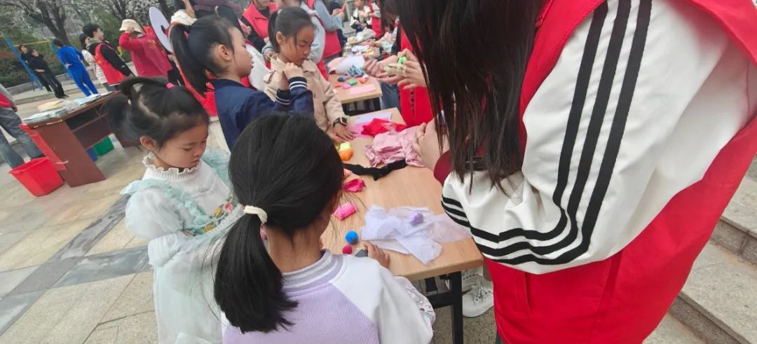 活动现场,五颜六色的彩纸与色彩斑斓的橡皮泥被整齐摆放在桌上。热情的志愿者们耐心引导小朋友们,开启了这场充满趣味的手工之旅。志愿者详细讲解了折纸与橡皮泥制作技巧后,小朋友们迫不及待地动手尝试。折纸环节,孩子发挥创意,纸飞机、纸船、千纸鹤纷纷诞生。橡皮泥创作时,活灵活现的小动物、诱人的食物、梦幻的城堡一一呈现,志愿者在旁适时协助 ,现场满是欢声笑语。