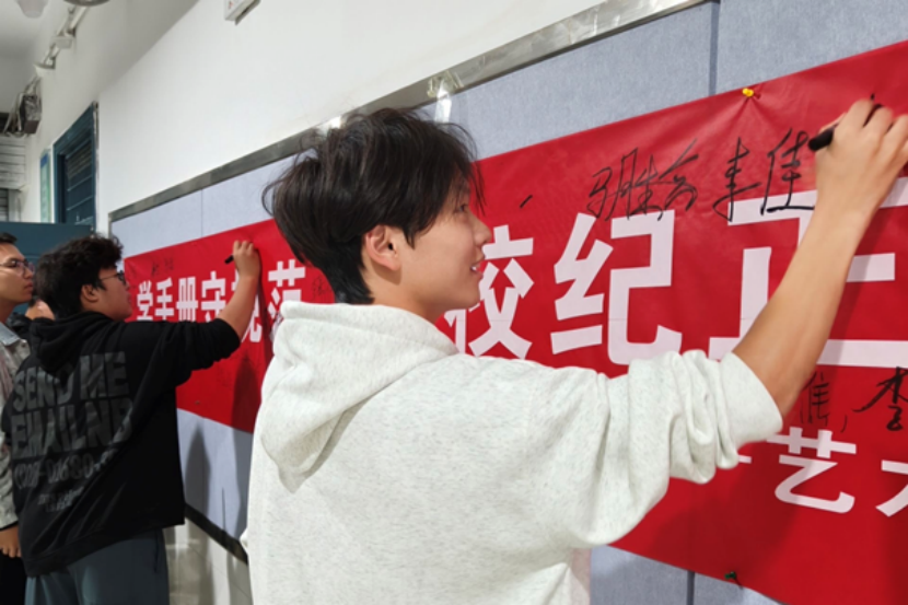 活动以一场庄重的签名仪式结束,新生们在“学手册守规范 校纪于心”主题横幅上认真签下姓名,以仪式感强化规则意识,让“知规守矩”的信念在笔尖落地生根。