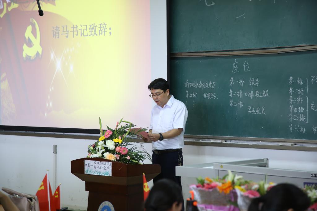 之后,马步伟作了重要讲话,他与全体党员共同回顾了党九十七年来发展历程和取得的辉煌佳绩。号召党员同志们积极学习党史、国史,以先进为榜样,提振精神,扎实工作,不忘初心、牢记使命。同时提出了几点希望和要求:一是牢固树立“四个意识”,锻造坚定的政治品格;二是要以身边的优秀党员、优秀教师等作为学习榜样;三是要求全体党员面对未来,不忘过去,面对成绩,不忘初衷。严格以党章和习近平总书记系列重要讲话要求自己,抓细、抓实基层党建,更好地推动组织工作融入大局,服务中心,为实现全面建成小康社会提供坚强组织保证。