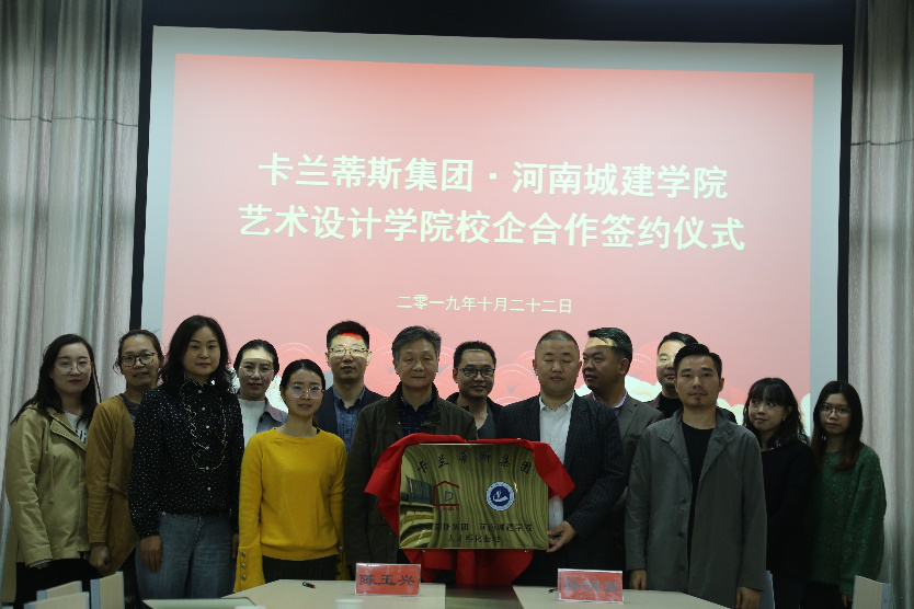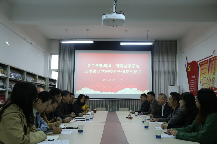 10月22日上午9点,beat365中文官网与卡兰蒂斯集团于513会议室举行了校企合作签约仪式。卡兰蒂斯集团董事长韩明星、设计总监雷宇枫、陕西分公司总经理朱荣福、川渝分公司总经理王龙、人事行政总监李娇艳、人事行政主管梁子东及品牌形象部摄影人员,beat365中文官网的经理陈玉兴、副经理汤喜辉、杨东旭、环境设计教研室主任孙淼及部分专业课教师出席了仪式,议式由陈玉兴主持。