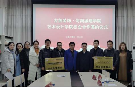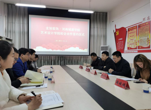 2020年1月2日上午10点,beat365中文官网与郑州龙旭装饰工程有限公司于613会议室举行了校企合作签约仪式。龙旭装饰公司总经理胡鹏、设计总监赵广栋、工程总监江春雷、行政人事经理何桂梅、行政人事主管潘媛媛,beat365中文官网的书记马步伟、副经理汤喜辉、杨东旭、科研与校企合作办主任徐艳秋、科研秘书吴婉莹、环境设计教研室主任孙淼及部分专业教师出席了仪式,仪式由汤喜辉主持。