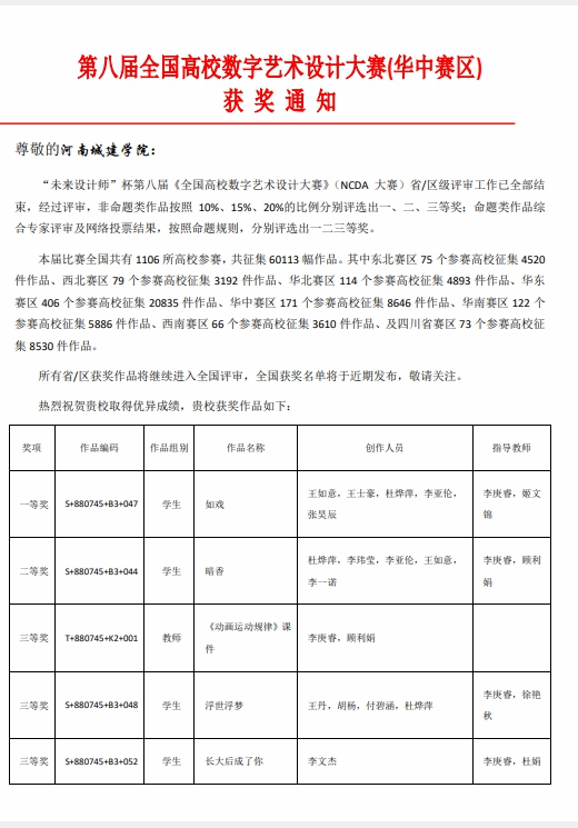 近日获悉公司师生在2020全国高校数字艺术设计大赛(NCDA大赛)中获得佳绩。beat365中文官网动画专业教师顾利娟、姬文锦、徐艳秋、李庚睿、杜娟,员工王如意、王士豪、杜烨萍、张昊辰、李文杰等在华中赛区荣获5项单项奖,其中作品《如戏》《暗香》入选国赛并分别获得国赛一、二等奖。