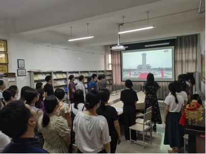 上午8时庆祝中国共产党成立100周年大会在北京天安门广场隆重举行,空中护旗梯队拉开飞行庆祝表演序幕。全体教职工与会场一同齐声高唱中华人民共和国国歌,五星红旗冉冉升起,在天安门广场上空高高飘扬。