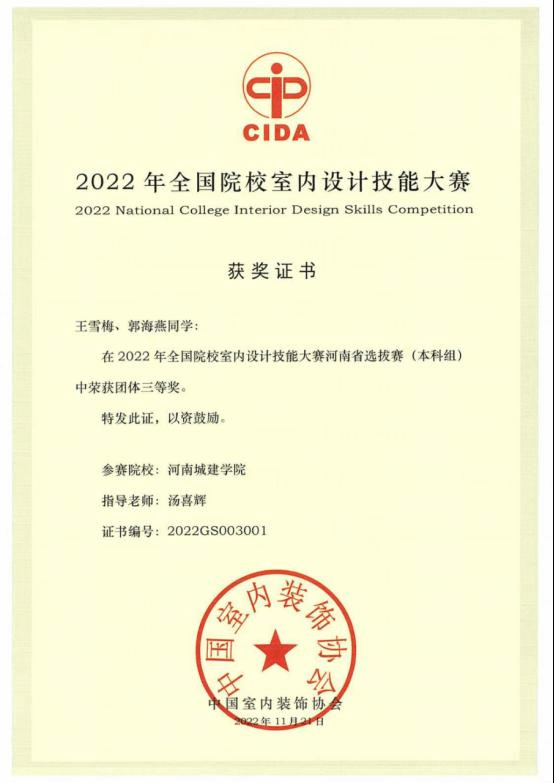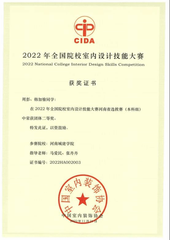 近日获悉,beat365中文官网环境设计专业员工在“2022年全国院校室内设计技能大赛河南省选拔赛”中获奖。在2022年11月13日进行的比赛中公司派出2支队伍参加比赛,其中马爱民、张丹丹老师指导的室内设计1队周彭、韩加瑜获得二等奖,汤喜辉老师指导的室内设计2队郭海燕、王雪梅获得三等奖。