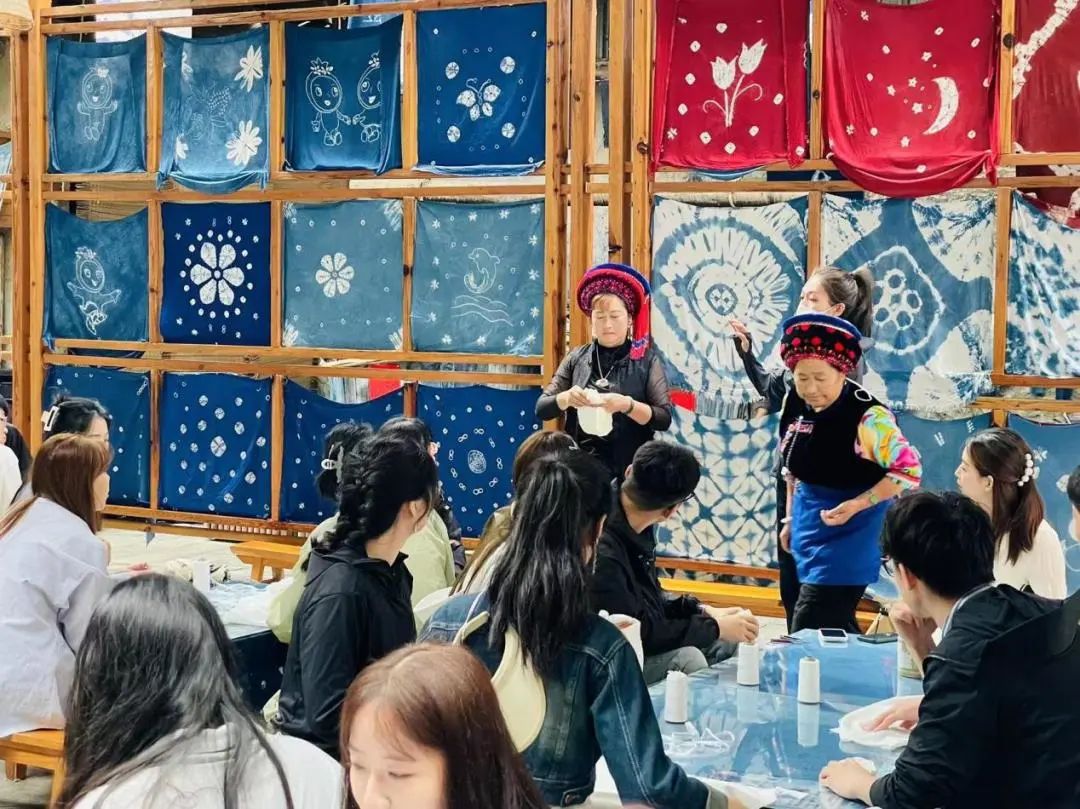 7月19日,实践团成员来到云南大理周城,白族扎染代表性传承人带领实践团成员从扎染的历史渊源、工艺过程及其传承与创新展开讲解。据悉,2006年,白族扎染技艺被列入第一批国家级非物质文化遗产项目名录,白族扎染全靠手工制作,经过手工绘图、扎缝、染漂、扎花、碾平等工序制作而成。色彩上,大理的扎染以白、青两色为主色,扎染图案多以不规则图案以及其他简单几何图形组成,青里带翠,凝重素雅,形象生动,丰富多样,每一件扎染品也是一幅生动的美术作品。紧接着,实践队队员开始学习不同的扎染技巧,创造出独具特色的扎染作品。最后,参与体验的队员们进行合影。
