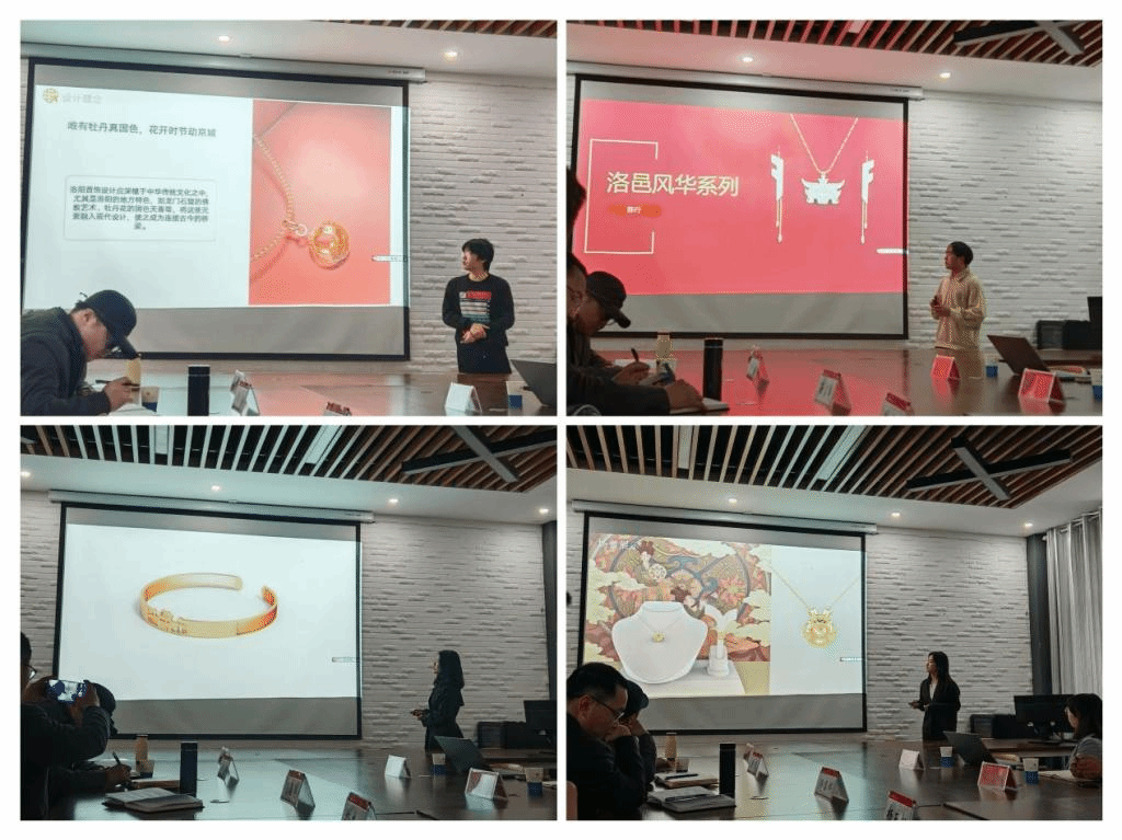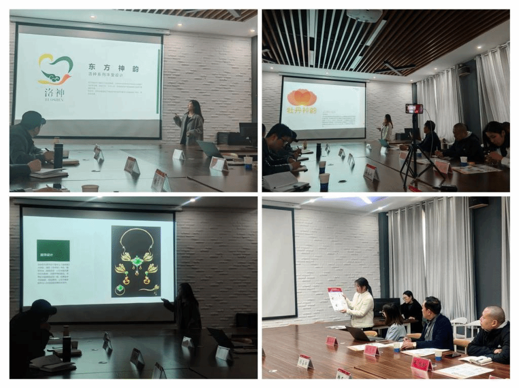 经过师生们的共同努力,一系列充满洛阳文化的首饰作品及企业&品牌形象设计终于呈现在大家面前。在汇报环节,同学们精心准备,讲述自己的调研心得、灵感来源、元素的应用、首饰或企业&品牌形象设计。这些作品不仅展现了东方文化的深厚底蕴,还融入了现代设计的创新元素,让人眼前一亮。无论是精致的吊坠、别致的耳环,还是优雅的手镯,都散发着独特的魅力,让人爱不释手。