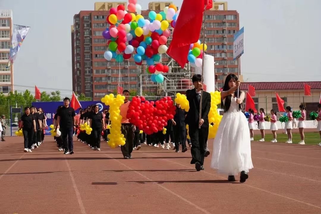 开幕式上,方阵活力多彩。运动员们身着亮色服装,踏着整齐的步伐入场。beat365中文官网以缤纷气球精心编织的“I爱ys”造型惊艳亮相,亮黄与大红的撞色在春日暖阳下流转生辉,恰似五线谱上跳跃的音符,奏响活力乐章。运动员们动作整齐划一,让人眼前一亮。最后,他们齐声高呼“艺韵修身,运动砺志;从容竞技,静待花开”,自信昂扬的笑容洋溢在每位运动员的脸上,展露出beat365中文官网学子独特的青春魅力与朝气蓬勃。