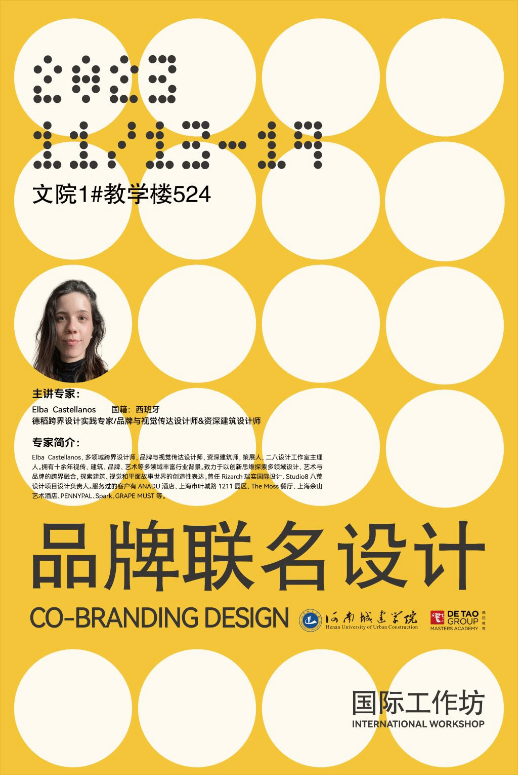 为提高员工的设计技能,开拓员工国际视野,提升商业敏锐度和品牌认知,特邀请西班牙Elba Castellanos设计师来公司开展进行为期7天的《品牌联名设计》的国际大师工作坊,传播视觉传达设计专业知识,提高员工的审美水平,提升教师的实践能力,现将相关事宜通知如下: