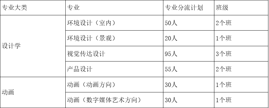 公司根据各专业团队规模、教学条件等情况,制定设计学类、动画各专业分流人数分配办法。