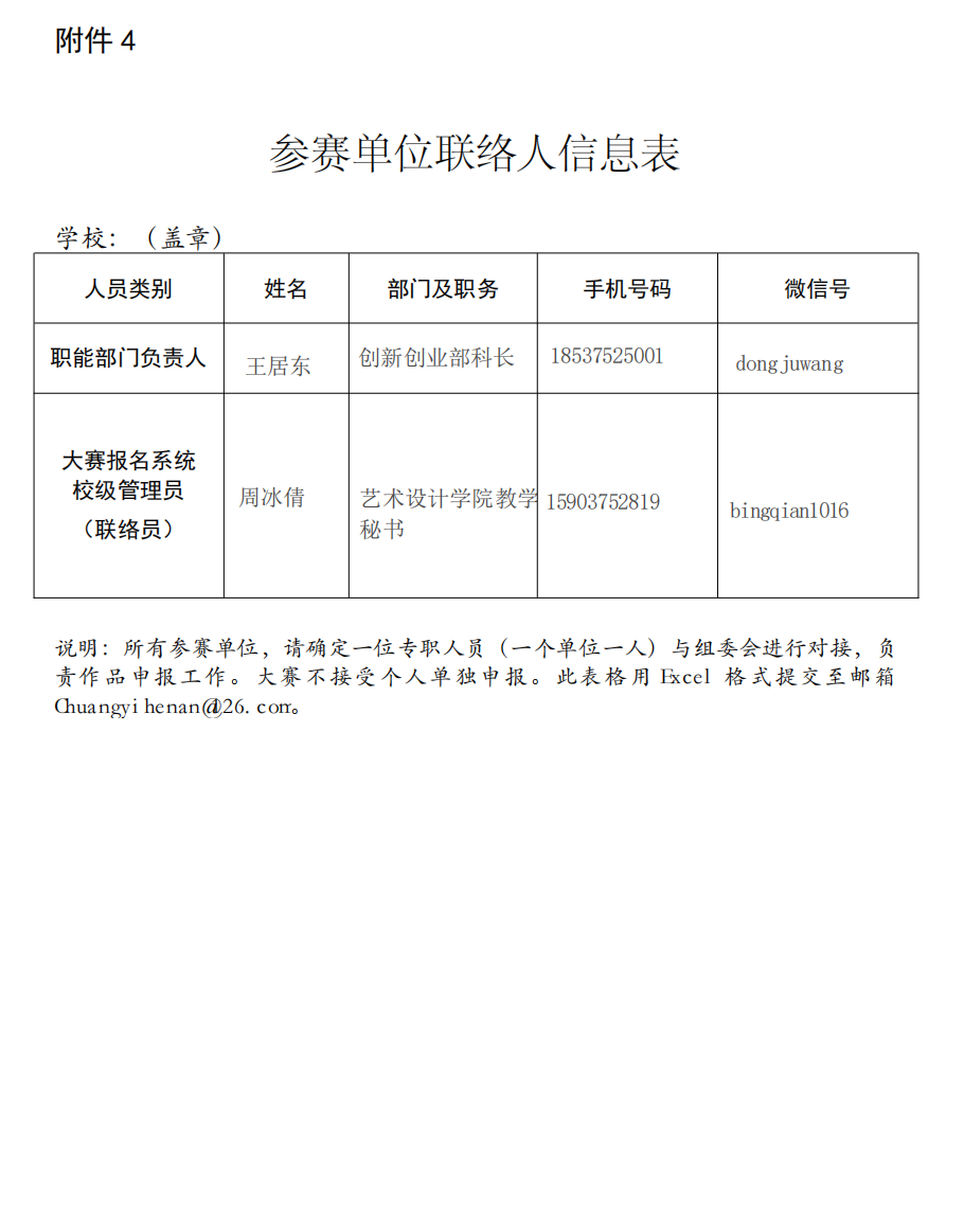各参赛公司安排 1 名工作人员作为公司联络员和大赛报名系统管理员,并于 9 月 30 日前将联系人信息表(附件 4,加盖公司公章扫描件和电子版)发送至邮箱 Chuangyihenan@126.com。各参赛公司提交管理员信息后分发本校登陆账号和密码。管理员可登录系统查看本校参赛项目报名情况,进行参赛作品审核推荐、晋级省赛项目等操作。若账号、密码遗失,可联系工作人员。